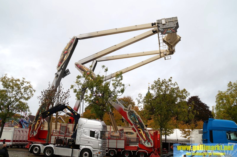 Am Donnerstag wurden die Straßen rund um den Gallimarkt gesperrt und bereits am Morgen begann der Aufbau des „Singenden Elch“. Um 17 Uhr durften dann die restlichen Schausteller auffahren. Zeitgleich trafen auch die restlichen Transporte des Riesenrades ein, wo man direkt die Transporte stellt, um am Freitag mit dem Aufbau beginnen zu können. Auch „Crystals