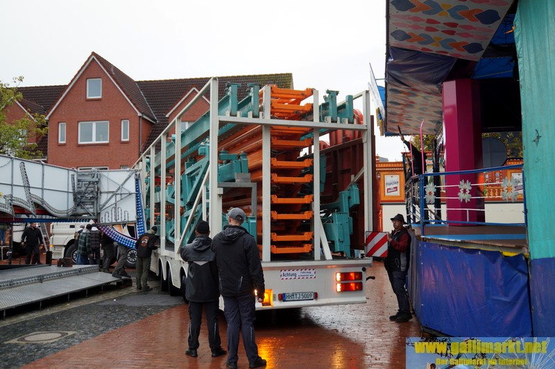 Nass, nasser, der 8. Aufbautag. Heute wurde trotz des bescheidenen Wetters der „Family Coaster“ aufgebaut und auch einige Reihengeschäfte sind dazu gekommen. In den späten Abendstunden wird zudem noch der „Airborne“ in Leer erwartet.