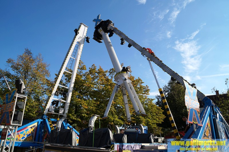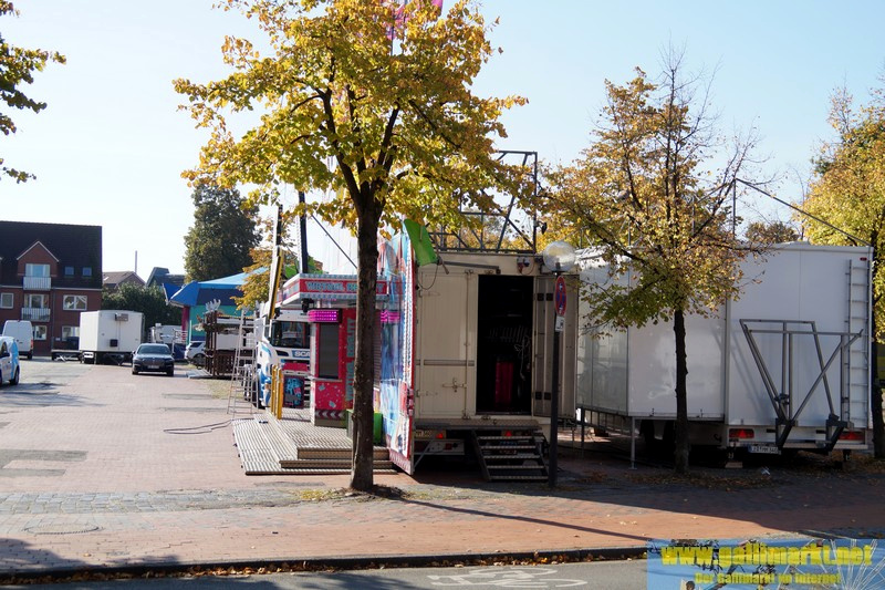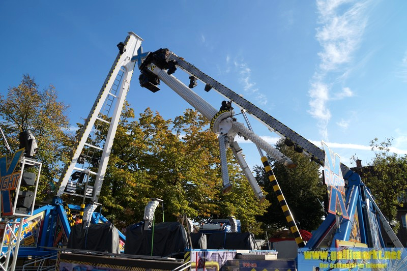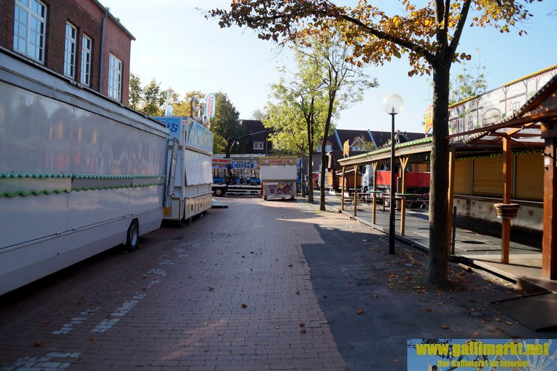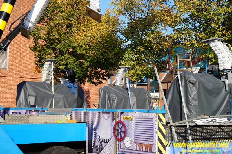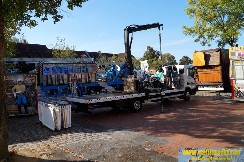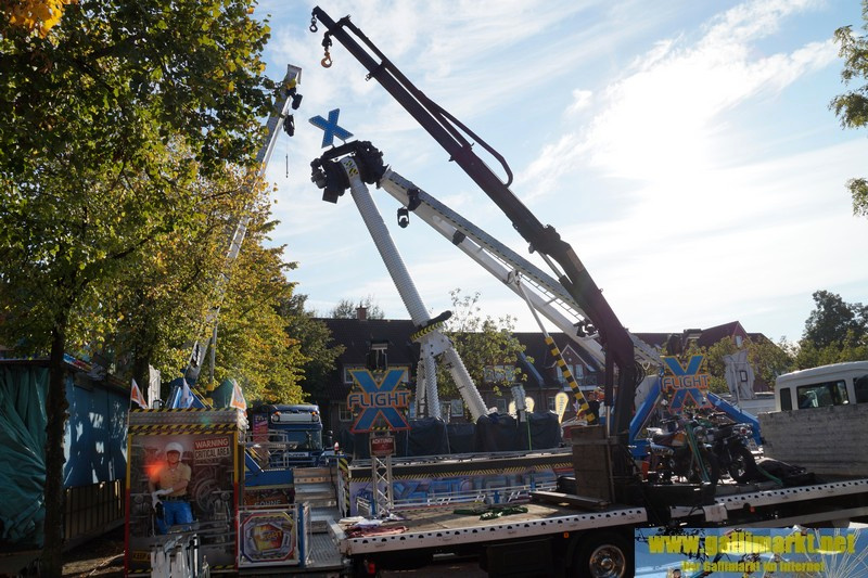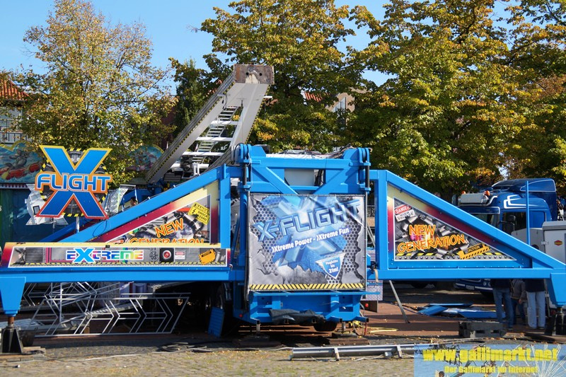 Heute war es wieder sehr ruhig auf dem Platz. Morgen wird es schon etwas hektischer, denn schon früh morgens werden die Schmiede- und die Garrelsstraße gesperrt, am Abend alle anderen Straßen rund um den Gallimarkt. Die ersten Geschäfte, die dort aufbauen, wurden heute bereits auf der Großen Bleiche abgestellt. Zudem ging bei „X Flight“ der Aufbau weiter und am Nachmittag trafen die ersten Transporte des Riesenrades ein.